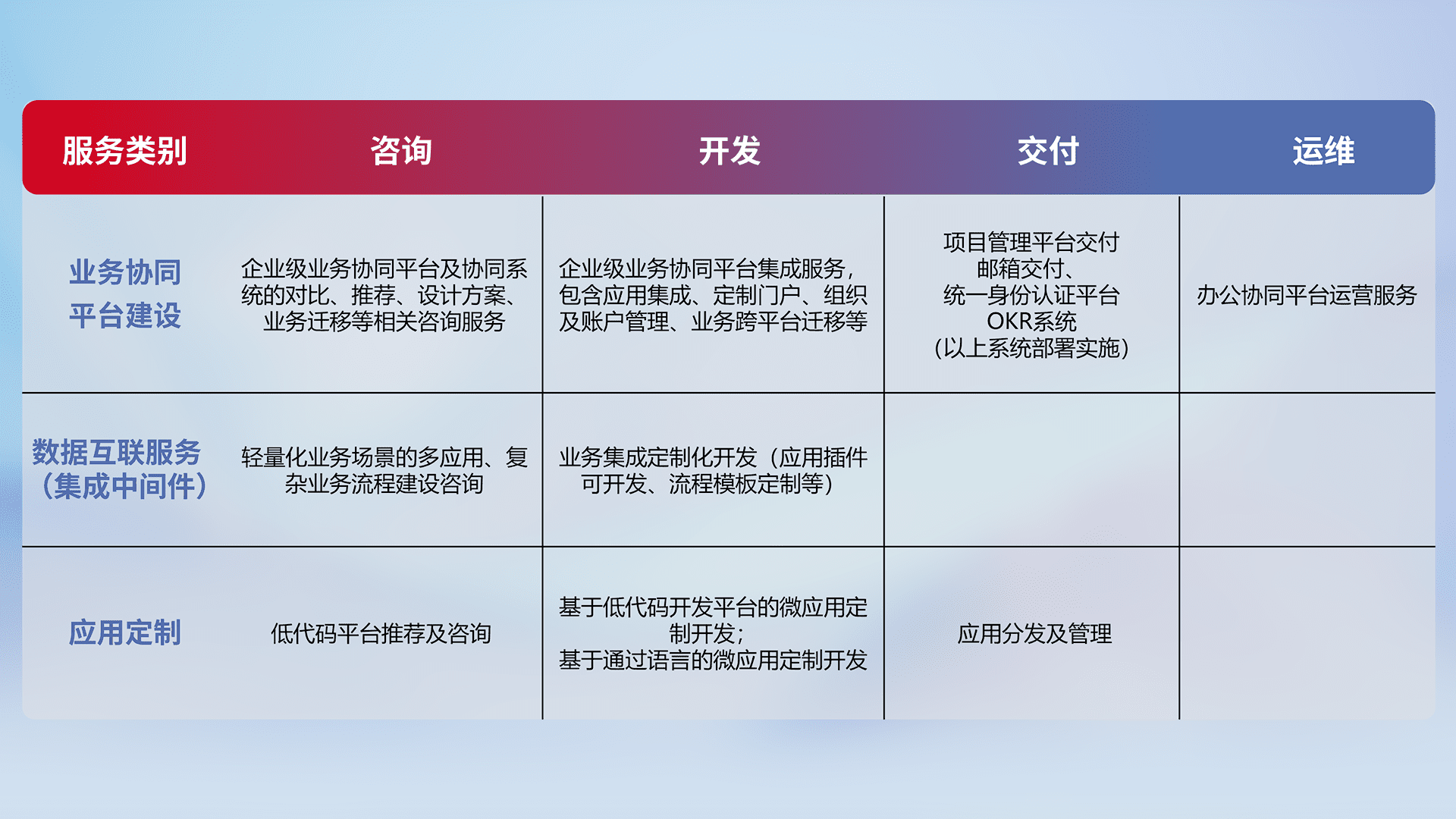 针对钉钉、、企微、、IDaas等平台级产品提供产品的规划、、、、方案、、、交付、、、、定制化开发等服务,,,,实现如统一协同办公、、、、智能客户服务、、、、混合会议管理、、、智能数据查询、、、等业务场景,,,实现数字化转型。。
